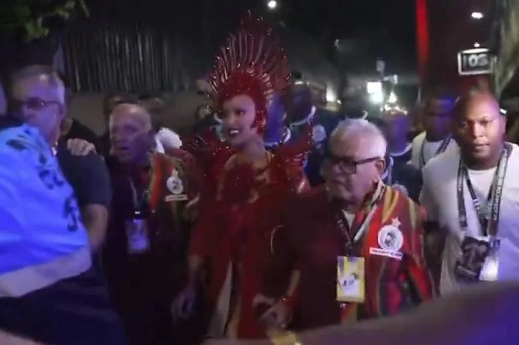 A passagem da influenciadora pelo sambódromo foi marcada por confusão. Pessoas com camisas da diretoria da escola empurraram repórteres e fotógrafos na concentração e durante o desfile.